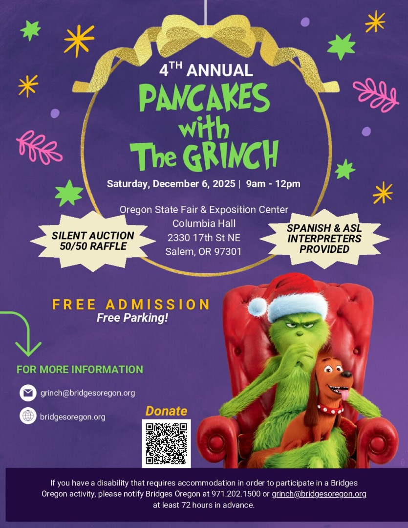 Start your holiday season with a stack of pancakes and a side of mischief! Join Bridges Oregon for a jolly morning of fluffy pancakes, festive fun, and a visit from everyone’s favorite grump—The Grinch!