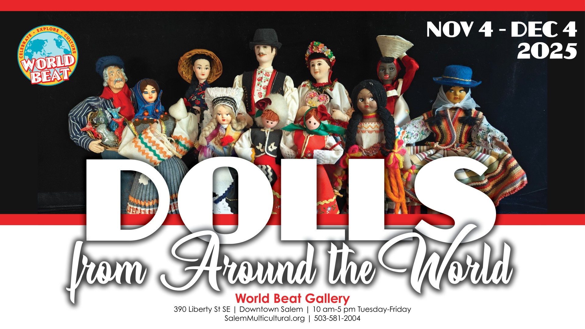 Stop in to the World Beat Gallery before December 4th and see this unique collection of dolls--all handmade and culturally authentic from the private collection of Ruth Harrison. Come learn about how dolls reflect society's values, rituals and artistic expressions--they were not just objects of play. (Appropriate for ALL ages!)