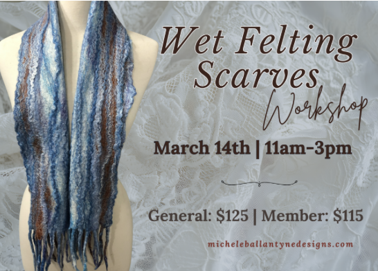 As requested, Michele Ballantyne is returning to The Oregon Garden to guide you through a wet felting scarf making workshop! You will get to create one multi-colored scarf up to 10 in. wide x 6 ft long that will keep you warm and stylish during the transition between Winter to Spring!