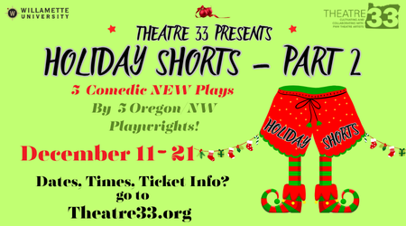 Holiday fun for the whole family. 5 new comedic Christmas short plays by 5 Oregon/NW playwrights! Evil elves, Mrs. Santa faces a revolt, stranded in an airport on Christmas Eve, a remarkable visit from Uncle Larry, and a cookie exchange that goes all wrong. Celebrate new plays, comedy, and Christmas with Theatre 33!