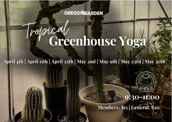 Join Tsipora Berman in a breathing, walking, stretching, strengthening exploration in the Oregon Garden, while staying dry and warm in our greenhouse. She will guide you through a multi-sensory, transformative, interdisciplinary yoga experience connecting Eco-Psychology, Physics, Neuroscience, Biology, Ecology, and the Arts, using a variety of mind/body practices. Learn how you can use curbs, trees, stairs, chairs and benches for yoga.
