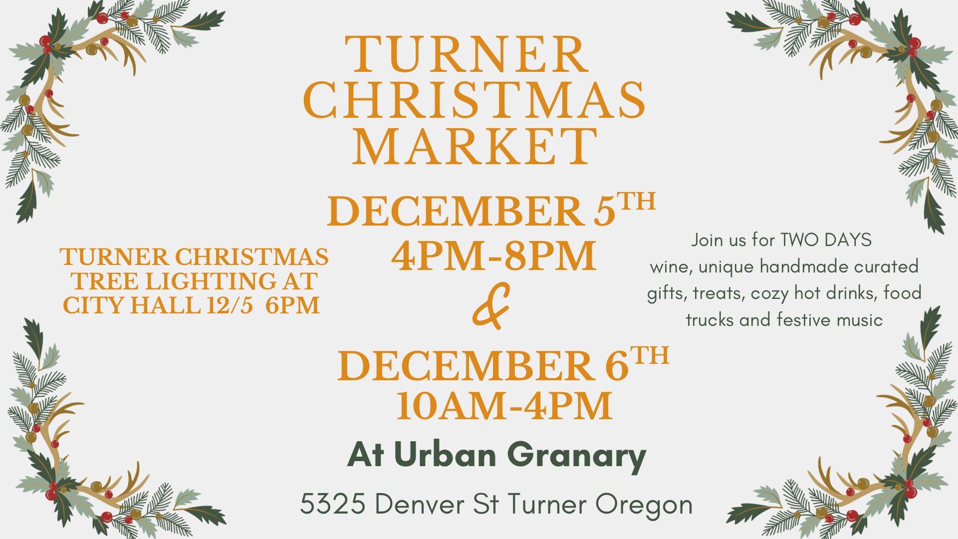 Join us for two days of wine, unique handmade curated gifts, treats, cozy hot drinks, food trucks and festive music.