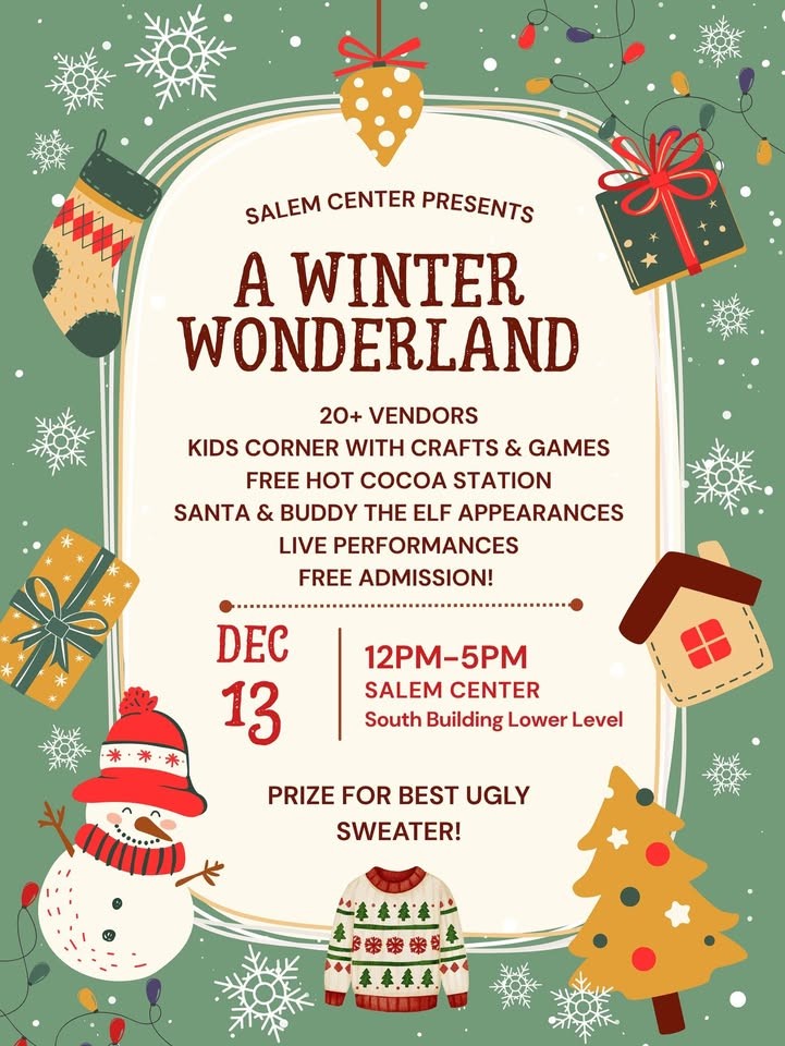 20+ local vendors with goodies & gifts for Christmas | Free hot cocoa station (while supplies last!) | Kids Corner with crafts, games & surprises | Santa and Buddy the Elf appearances | Live music, dancers, and carolers | Prize for the Best Ugly Christmas Sweater